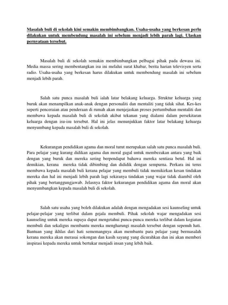 Contoh karangan punca dan cara mengatasi budaya buli dalam kalangan pelajar sekolah. Number of times this content has been viewed 10 button to like this content button to share. Melihat angka itu sahaja pasti amat membimbangkan ibu bapa serta membuatkan ramai pelajar menjadi takut untuk ke sekolah.